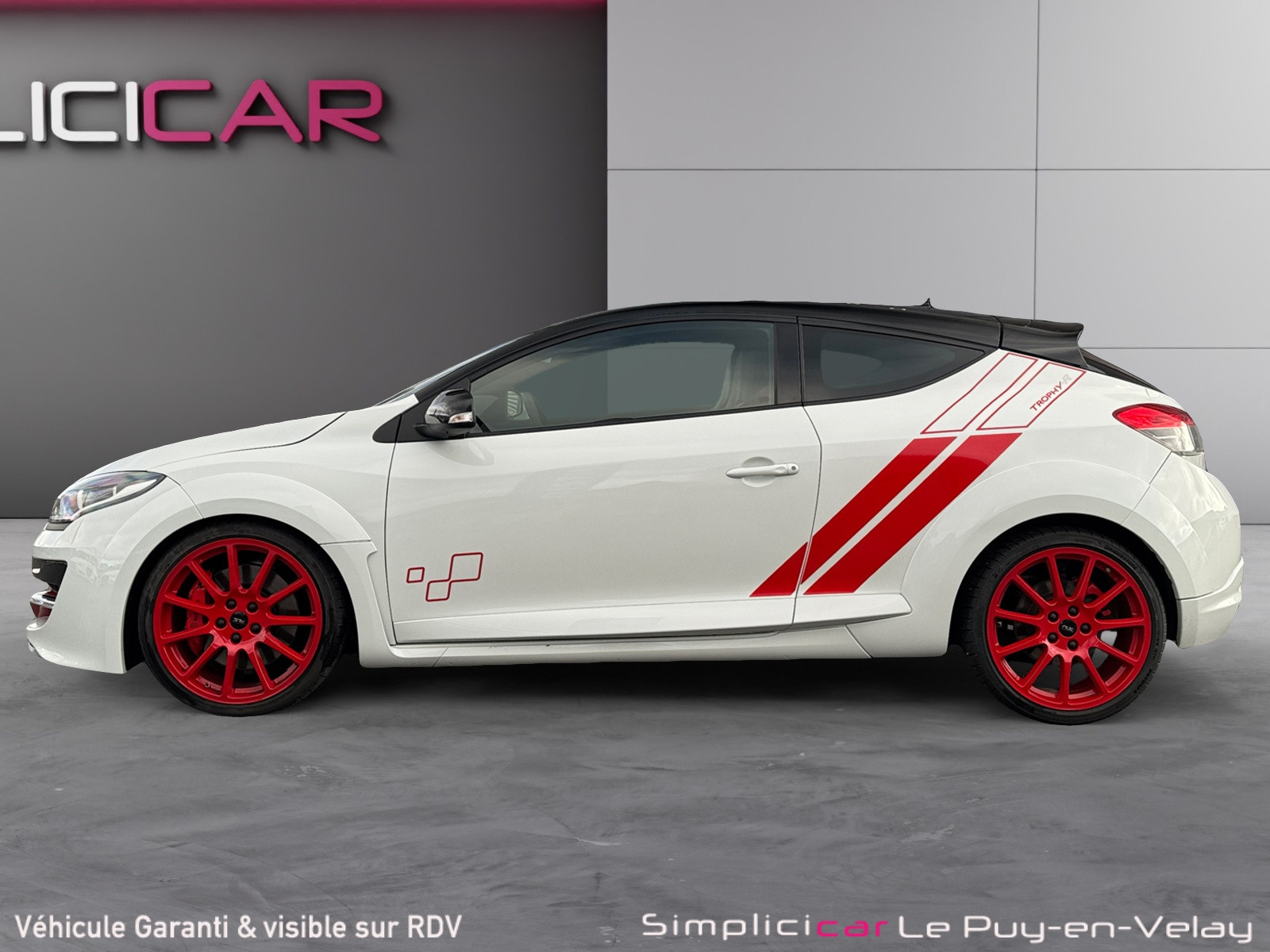 (ESP tri-modes), Sellerie Recaro Cuir/Alcantara Noir, Sticker Trophy-R sur lame F1 rouge vif, Stripping latéral rouge vif Trophy-R, Train avant à pivot indépendant, Jantes Alliage 19" Speedline Turini Rouges, Toit Noir Etoilé.